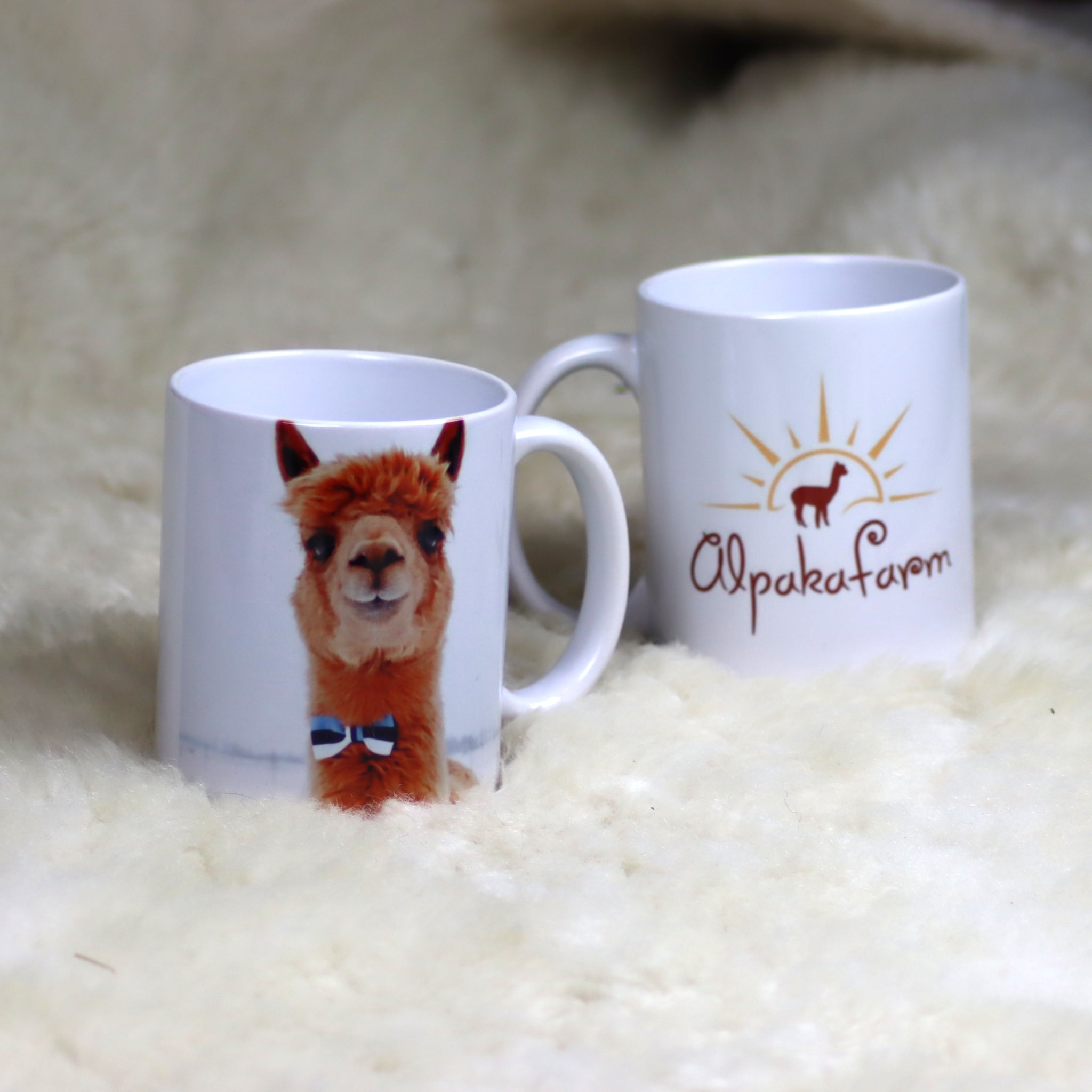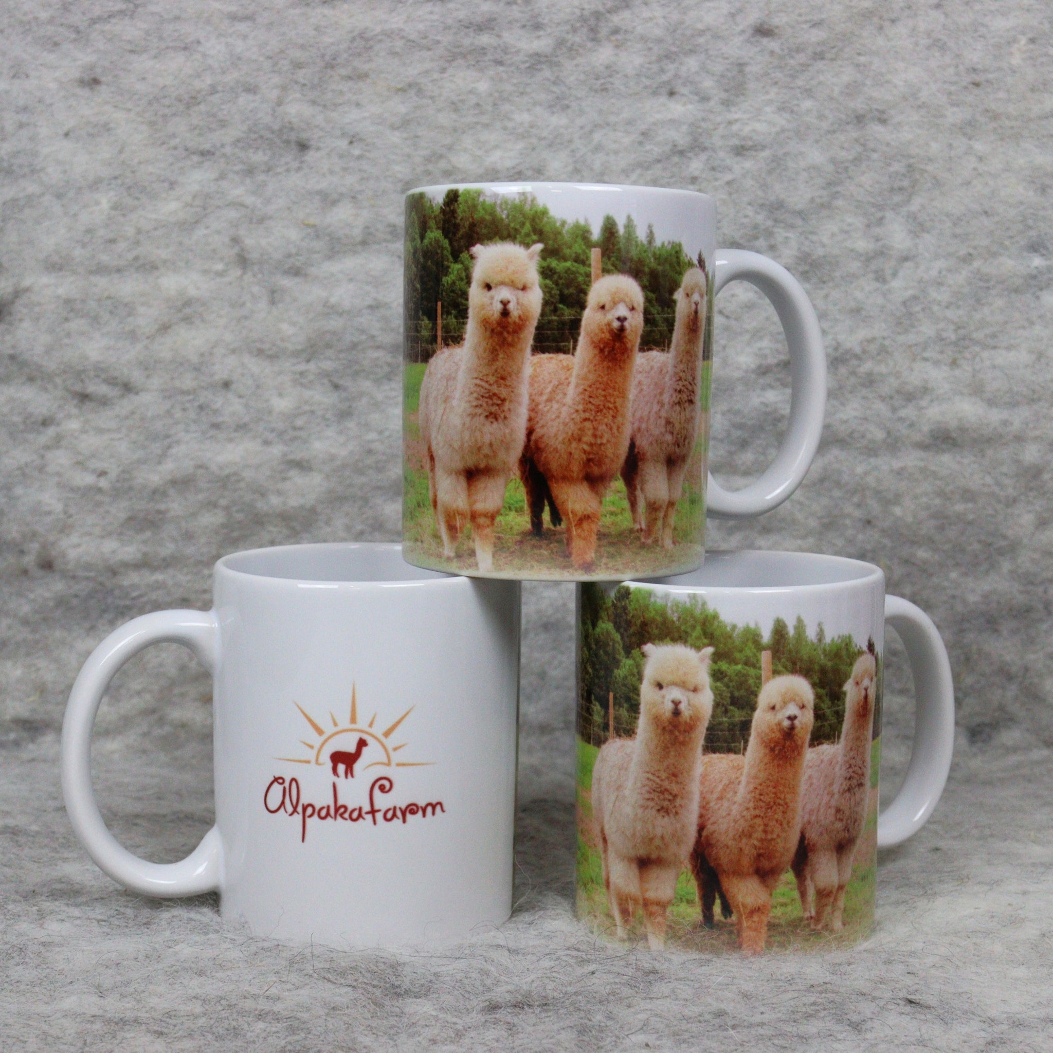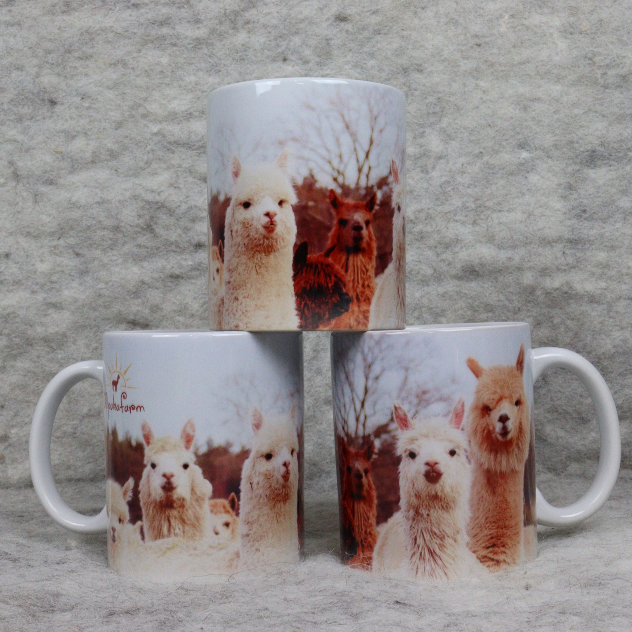 Erilaisia kuppeja, joissa on kuvia Alpaca-tilaeläimistä sekä muita malleja.